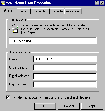 tab. 1.click on Add, 2. click display name: type in your name. 3.check I already have an email address, then type in your email address. 4.Type in mail.ncwonline.com under incoming mail server. 5. outgoing (SMTP)