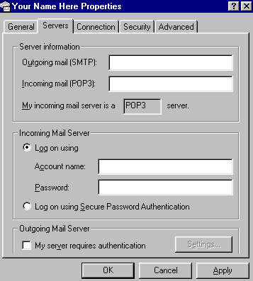 Outgoing (SMTP) mail server settings: Incoming mail use: mail.ncwonline.com Note: On newer versions of outlook express the incoming mail is on the top and outgoing (SMTP) mail is on the bottom. Please take note of this and fill out the fields correctly. Note, below is the setting that needs to be changed for the new email server. In the account name box enter your entire email address: you@ncwonline.com. Note: if making changes for the new email server you are finished - you do not need to change your account password, go to part 5 below. Enter in your password - lower case, no spaces Make